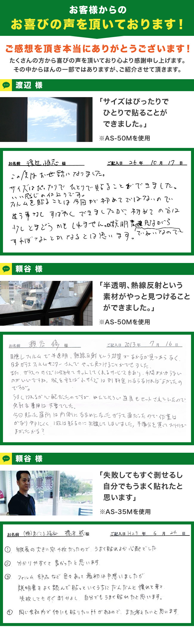① お客様の声をフィルムを貼り付けたガラスの写真と共に投稿いただいた方全員にもれなく、クオカード300円分をプレゼントいたします。