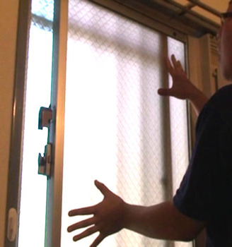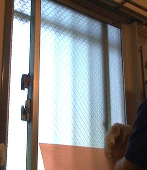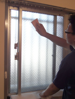 最初に購入したフィルムのサイズの確認を行います。 実際にガラスに当てて確認します。 特に大きい窓の場合は2人で行うとスムーズに確認できます。 |