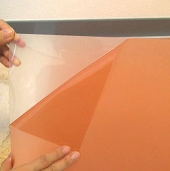 片手をフィルムとガラスの間に入れて剥離紙を剥がしていきます。 |