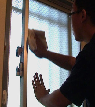 ガラスの下の部分は濡れないようにビニール等で養生しておきましょう。 薄めた中性洗剤をスポンジタワシに含ませてガラスを全体的に磨きます。 頑固な汚れはカッターなどで擦ると取れやすいです。 ポイント |