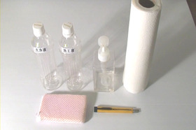 用意する物 ★市販の空のペットボトル(500ミリ)×2 ★中性洗剤(お皿を洗う洗剤でOK) ★スポンジ・キッチンペーパー ★カッター(もしくはスクレーパー) ★養生用のタオル又はゴミ袋 |