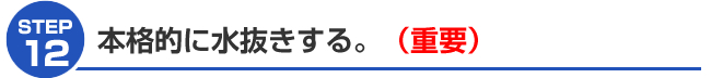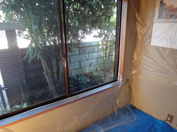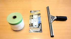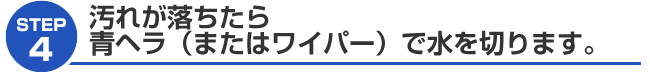 洗浄後に付属の青ヘラで水を切っていきます。青ヘラの場合は、一定方向に(上から下)に除去するのがコツです。 施工面積が広い場合はワイパー(水切り用ゴムへラ)があれば作業がスムーズに進みます。 |