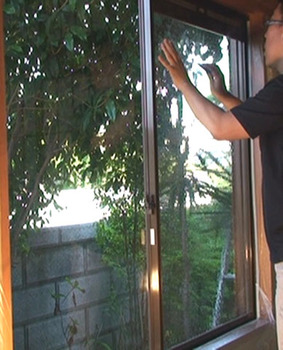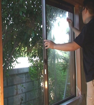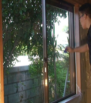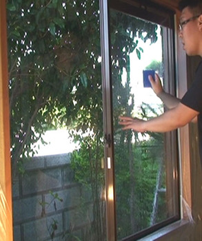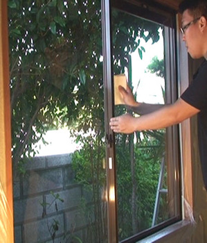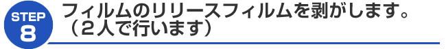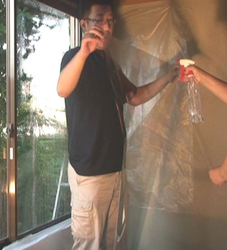 一人がフィルムを持ちもう一人がリリースフィルムを剥がしながら施工液をフィルムの接着面(ベトベトした面)にまんべんなく噴きつけていきます。 |