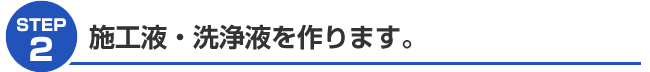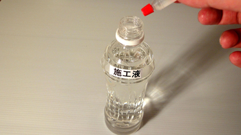 予め用意しておいた500mlのペットボトルに水を入れ、そこに付属のミニ施工液を1本入れてスプレーヘッドを装着し、軽く振れば施工液の完成です。 洗浄液はペットボトルに水を入れ |