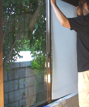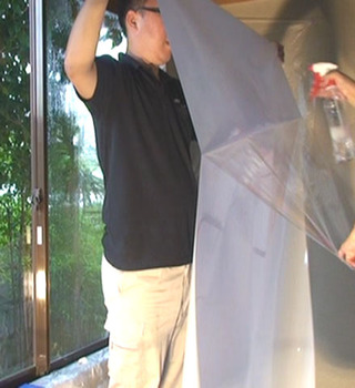 一人がフィルムを持ちもう一人がリリースフィルムを剥がしながら施工液をフィルムの接着面(ベトベトした面)にまんべんなく噴きつけていきます。 |